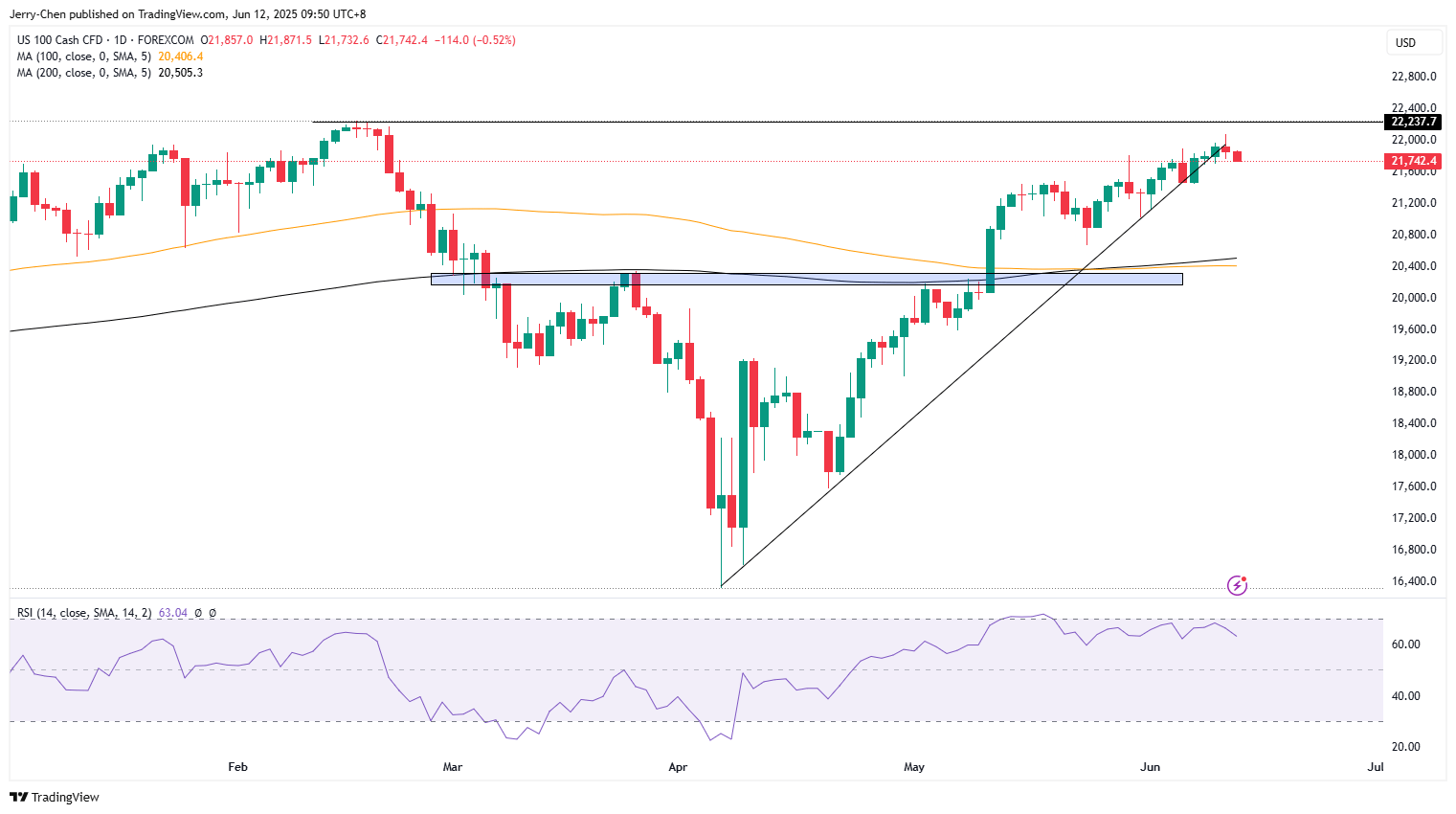 尽管纳斯达克100指数整体的上涨趋势仍在延续且市场情绪依然乐观,但在历史高点附近,经济数据和关税政策对指数造成的扰动可能变得更为明显。