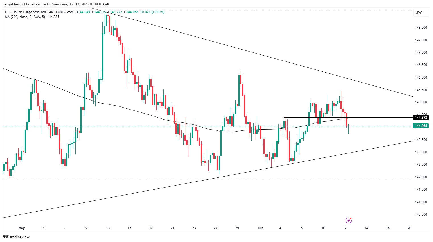 由于低于预期的美国通胀数据继续打压美元,美/日周三也顺势回落,延续收敛形态。若反弹无法回到144.40上方,后市或继续震荡下行考验4月以来的趋势线143附近的支撑。