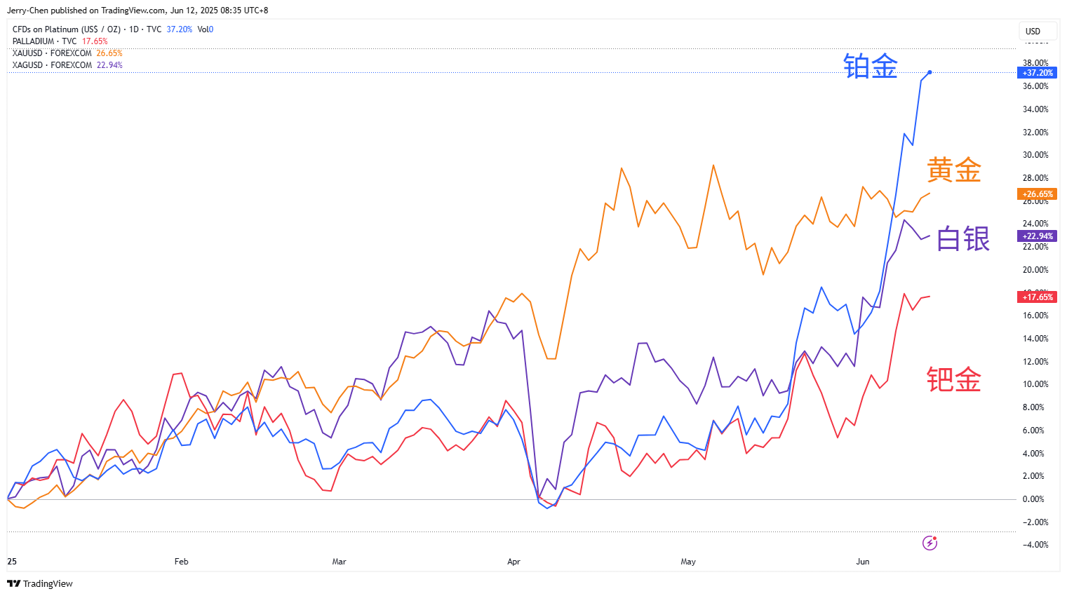 贵金属2025年涨幅对比 来源:Tradingview